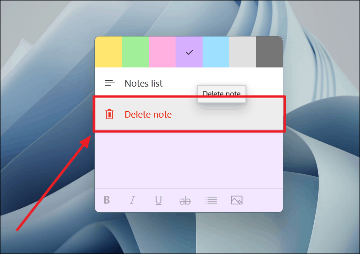 Step 2: Select "Delete note" from the dropdown menu. A confirmation prompt may appear; confirm to delete the note. You can also press Ctrl+W while the note is in focus to delete it quickly.