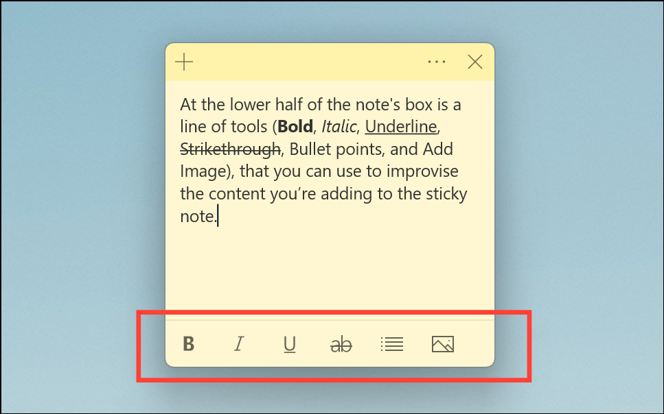 You can also use the formatting toolbar at the bottom of the sticky note to apply these styles by clicking on the respective icons.
