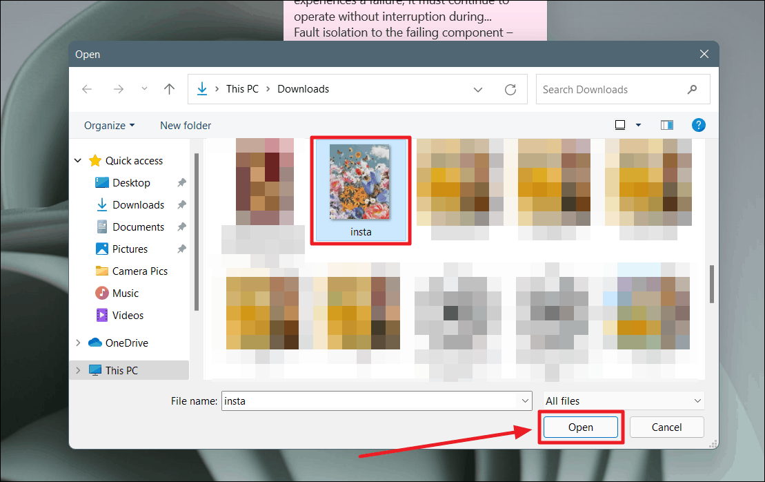 Step 2: A file explorer window will open. Navigate to the image you wish to add, select it, and click "Open."