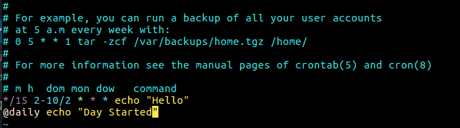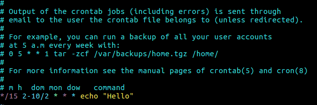 */15 2-10/2 * * * echo "Hello"After adding your entries to the cron file, save the file and exit the editor.