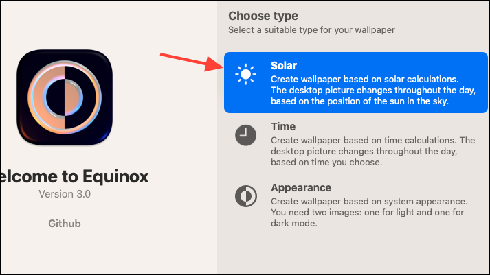 Step 3: With your wallpaper settings and images ready, open the Equinox app. Select the type of dynamic wallpaper you want to create. For this example, we'll create a 'Solar' wallpaper. Double-click on 'Solar' to proceed.