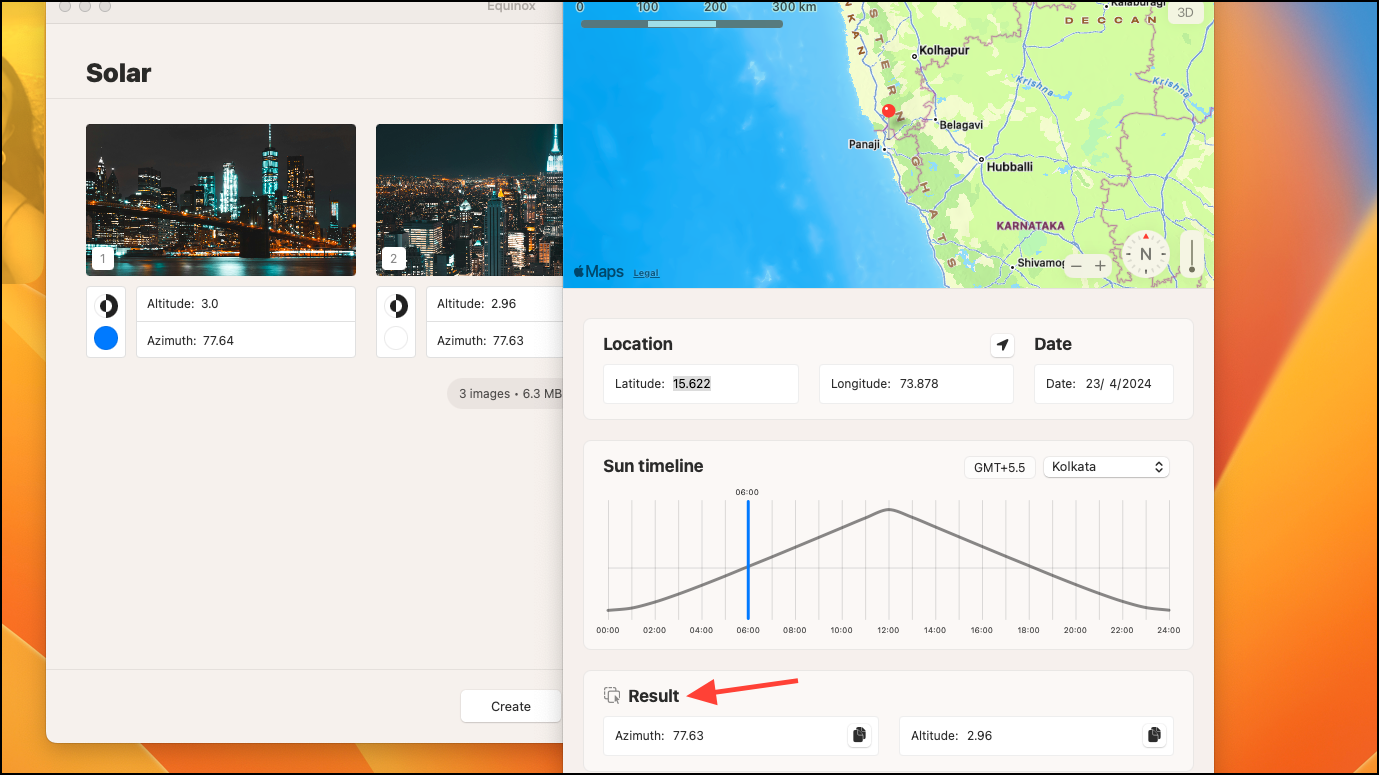 Step 7: The Altitude and Azimuth values will update in the 'Results' section based on your input. Drag and drop these values below the corresponding photo in Equinox. Repeat this process for each image you've added.