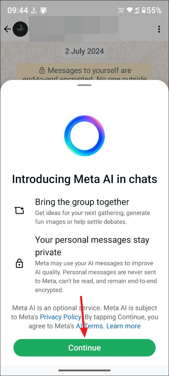 - This will introduce you to Meta AI if you haven't used it before. Tap on the 'Continue' button.
