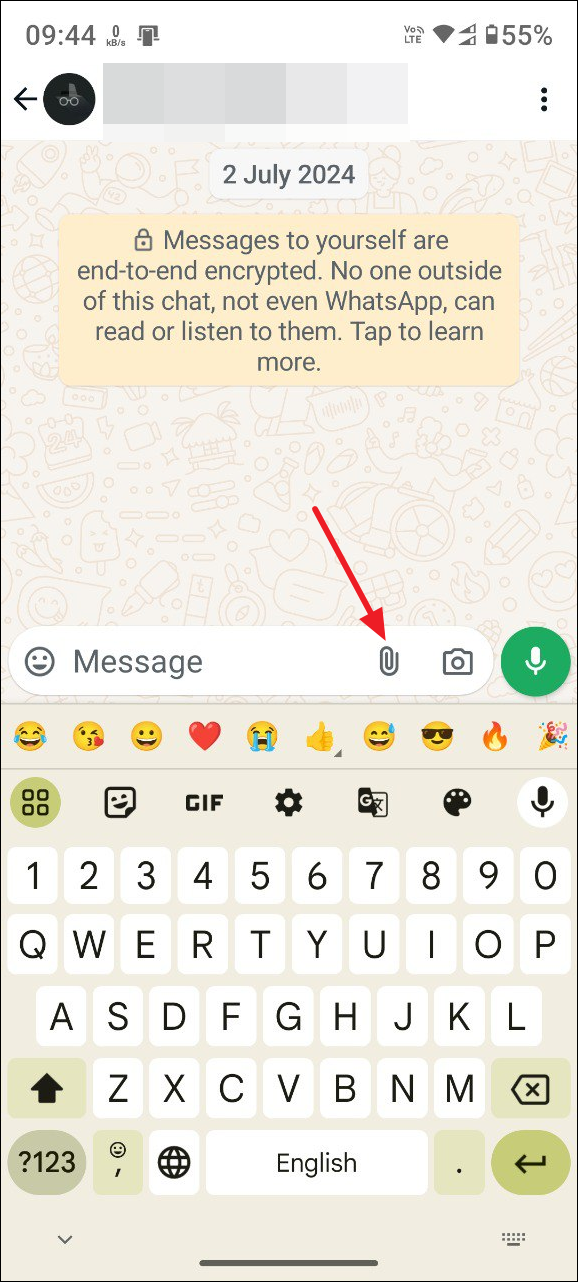 - Open the WhatsApp chat where you want to send a GIF and tap on the 'attach' icon which appears like a paperclip near the text box.