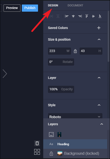 All the elements that you add to a page are added as separate layers so you can edit each layer separately. To edit an element, click on it. It will be highlighted by a blue boundary, you can drag it to position it anywhere on the page, resize it and use the design tools on the right for each element.