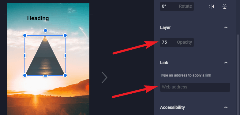 Every layer will also have a couple of common design tools: Opacity and Link. The opacity of each element is 100 by default, but you can decrease it. You can also add a link to any element in the story, but Google suggests that you should not have more than one link on a page.