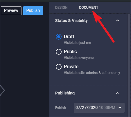Click on the ‘Document’ tab to switch from design tools to the document tools. This includes the standard WordPress publishing tools and then some more. In addition to the ‘Draft’, and ‘Public’ status, a story can be set as ‘Private’ so it will be visible to site admins and editors too but not the public.