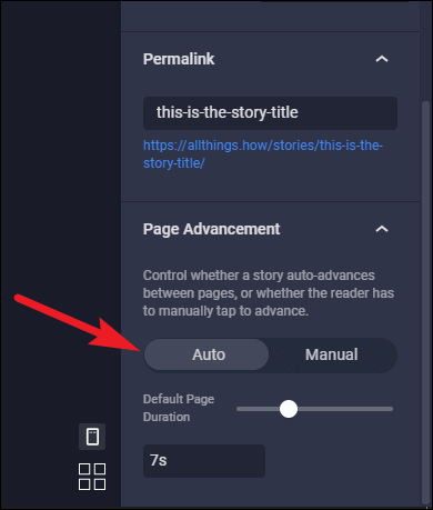 Other than that, you can add a date, logo, and cover image, and edit the permalink. And most importantly, you can configure the page advancement settings. Page Advancement setting involves whether the story auto-advances or the reader has to manually tap to advance the pages.