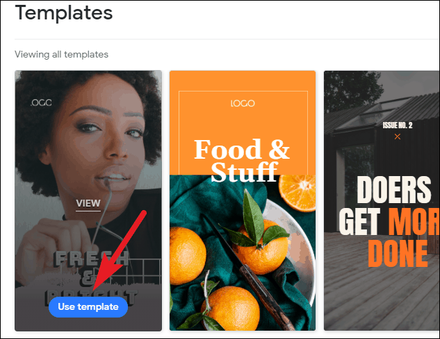 Hover on a template and a few options will appear. Click on ‘View’ to view the pages in it, and ‘Use Template’ to open it in the editor and start editing the story.