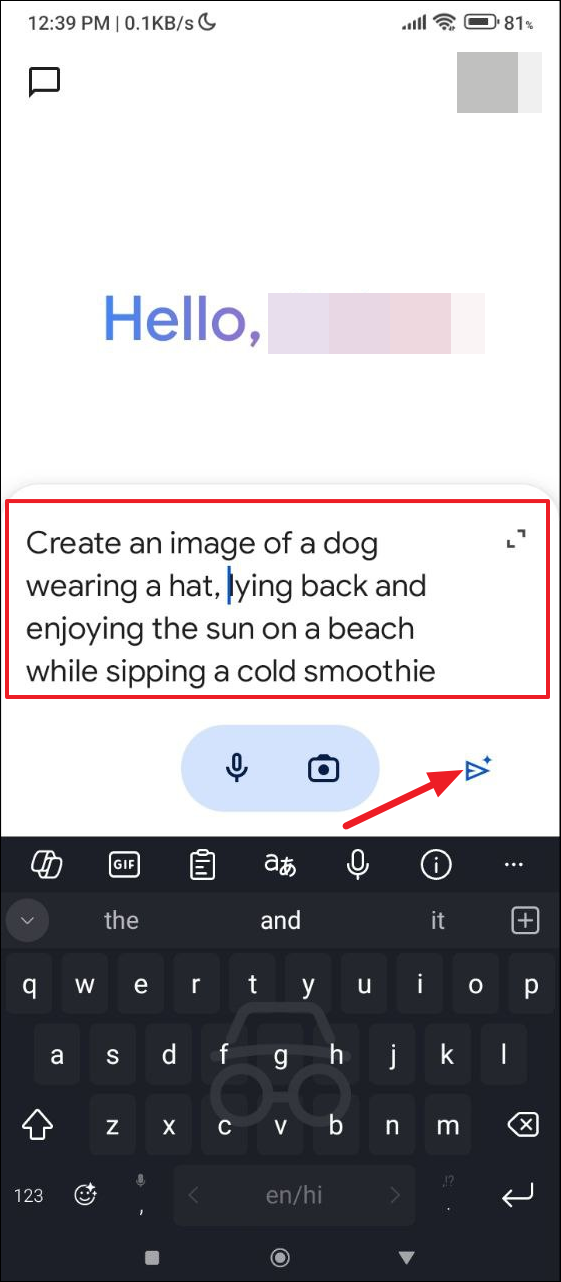 - Once Gemini opens on your screen, type in the prompt you want to use to generate an image and tap on the arrow on the right of the prompt box.