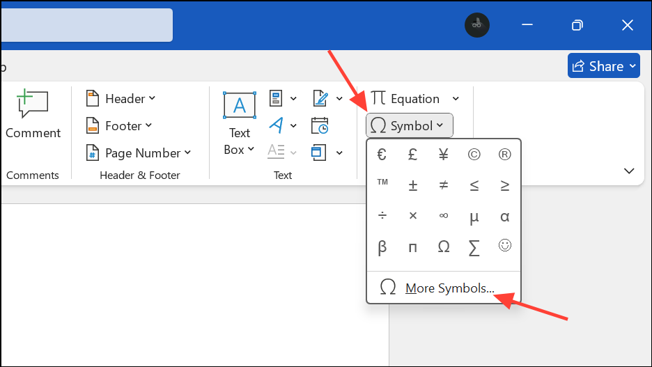 Step 2: Select Symbol (usually found at the far right of the Ribbon), then click More Symbols.