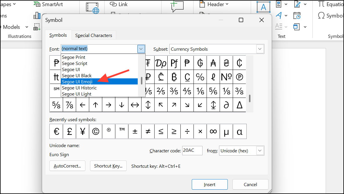 Step 3: In the Symbol dialog, change the font to Segoe UI Emoji. If needed, adjust the subset to “Extended characters – Code area 1” to view more emojis.