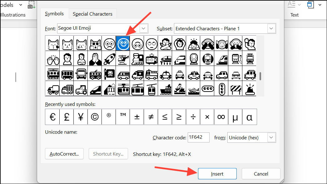 Step 4: Scroll to find the emoji you want, click it, and select Insert. The dialog remains open, so you can insert multiple emojis without reopening it.