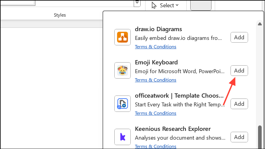Step 2: Search for “Emoji” or “Icons” in the add-ins store. Choose an add-in that fits your requirements and click Add.