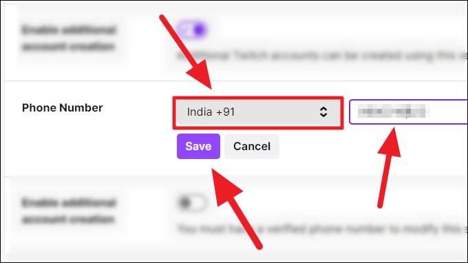 Now, click the drop-down box next to ‘Phone number’ to choose your country code. Then, add your verifiable phone number in the text box next to it. Once done, hit the ‘Save’ button in purple.