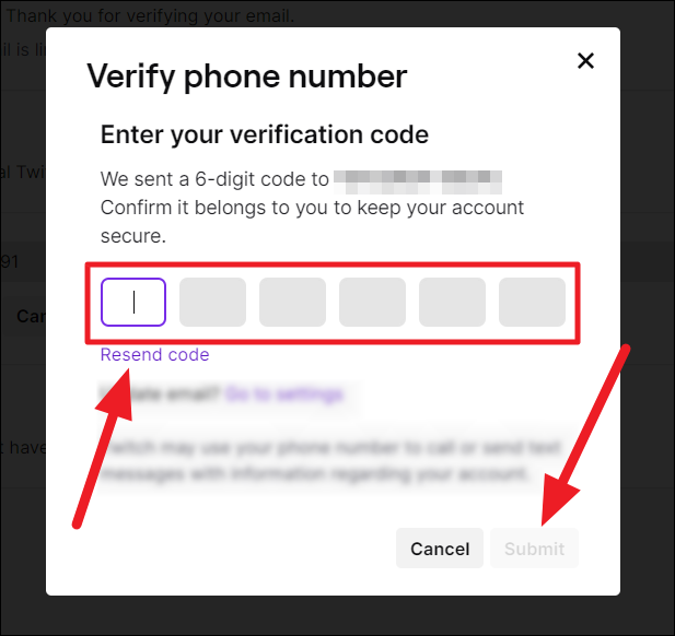 Enter the verification code sent on your phone number in the six boxes provided in the following dialog box. If you didn’t receive a code or can’t find it, click ‘Resend code’ to receive a new code. Once the code is entered Twitch automatically accepts the code. If that doesn’t happen, click the ‘Submit’ button to the bottom right corner of the box.