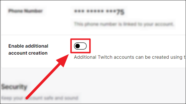 Now, all that’s left to have multiple accounts with your Twitch verified phone number is to enable the feature. Simply click the black and white toggle button next to ‘Enable additional account creation’ below ‘Phone Number’ in the ‘Contact’ section. The toggle ought to be filled, purple, and with a tick mark.