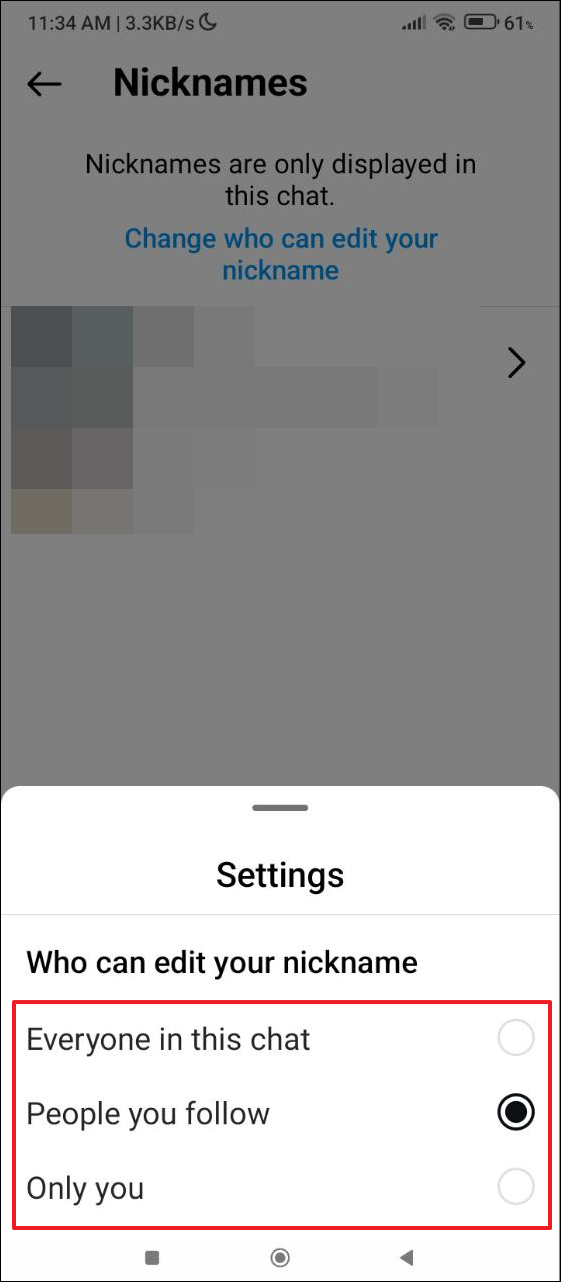 - Then you can tap on any of the three options available to choose who can change your nickname.