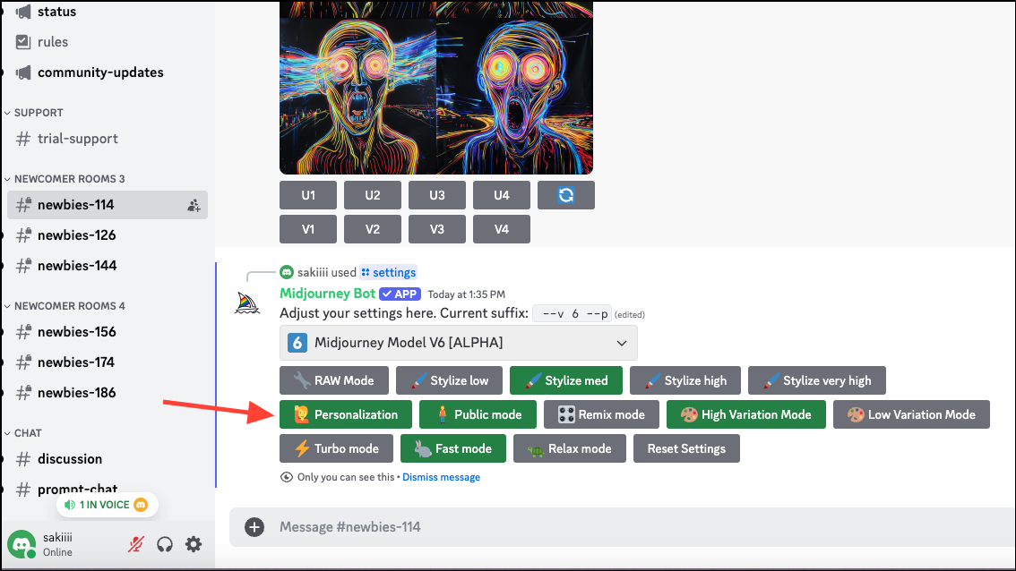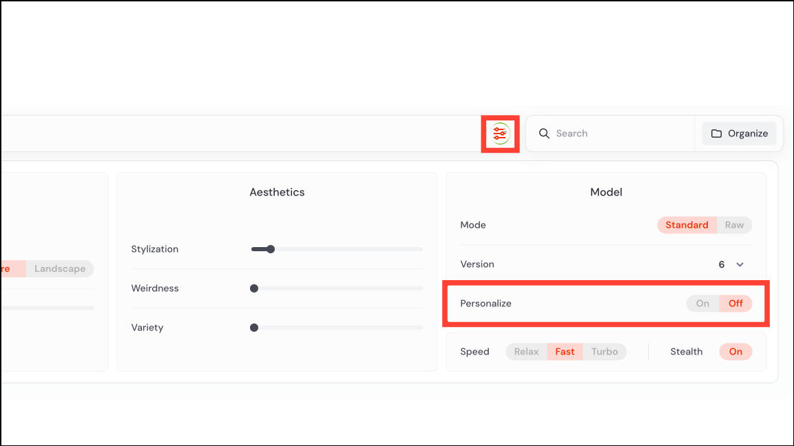 - If you are using Midjourney web, click on the 'Controls' icon next to the Imagine bar and select 'On' next to Personalize.
