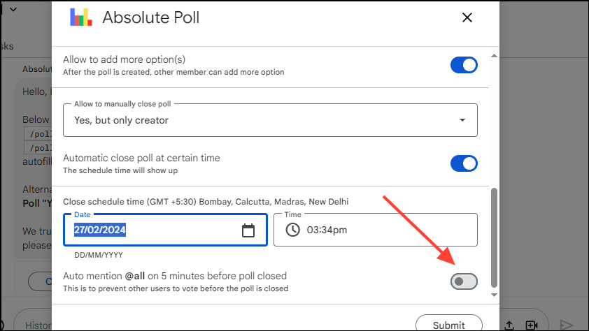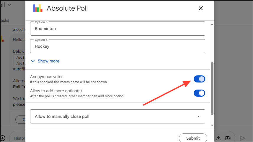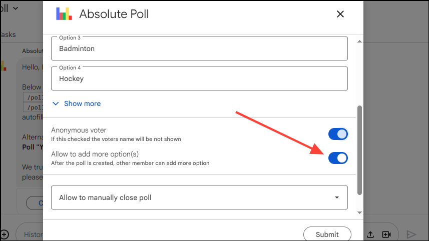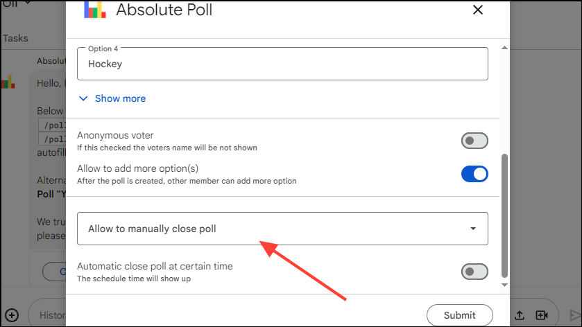 - Absolute Poll also allows controlling who can close the poll. Click the 'Allow To Manually Close Poll' option to view the available options.