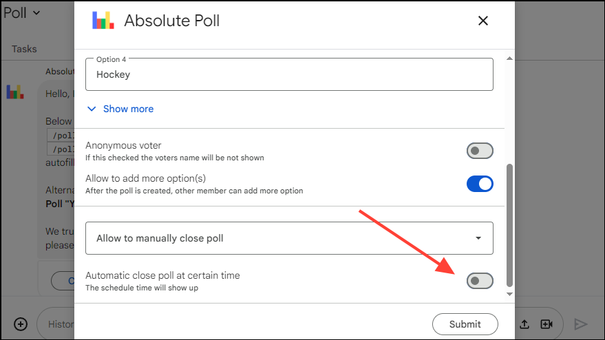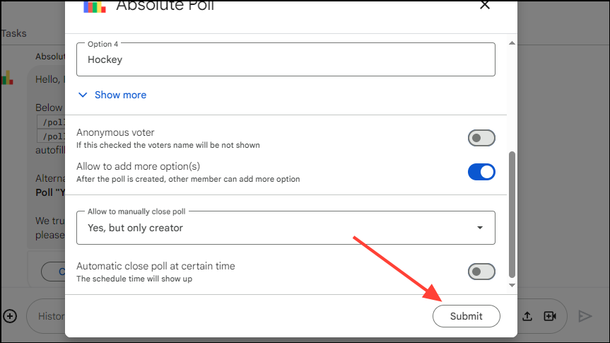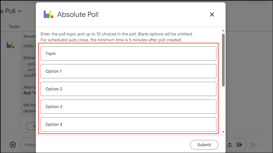 The Absolute Poll app offers an excellent method by which you can add polls in Google Chat. It is easy to use, can be customized without effort, and is well-suited for different purposes. Furthermore, polls can be anonymous and ensure complete privacy, so you can use this app without any worries.