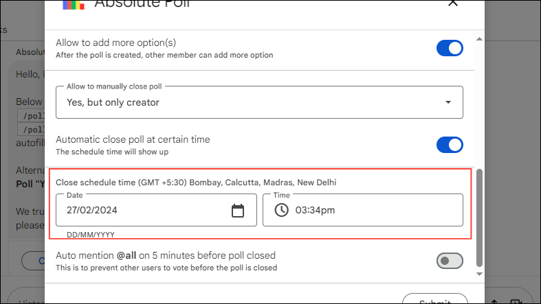 - Finally, the last poll setting lets you create a poll that automatically closes after a certain time.