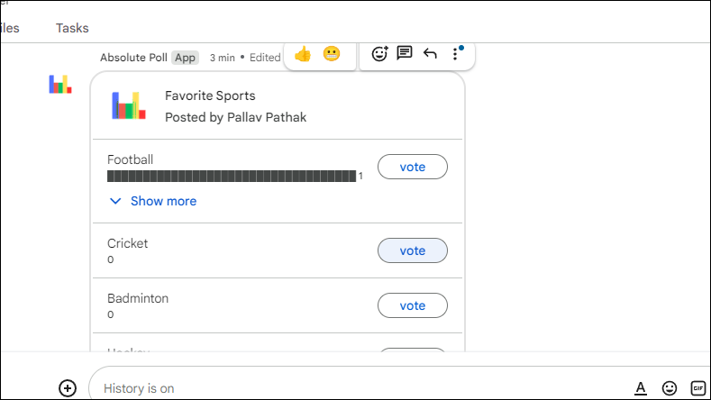 - The poll will be added to the chat and all members of that Space can click on any of the 'Vote' buttons to vote for a particular option.
