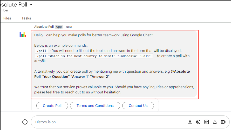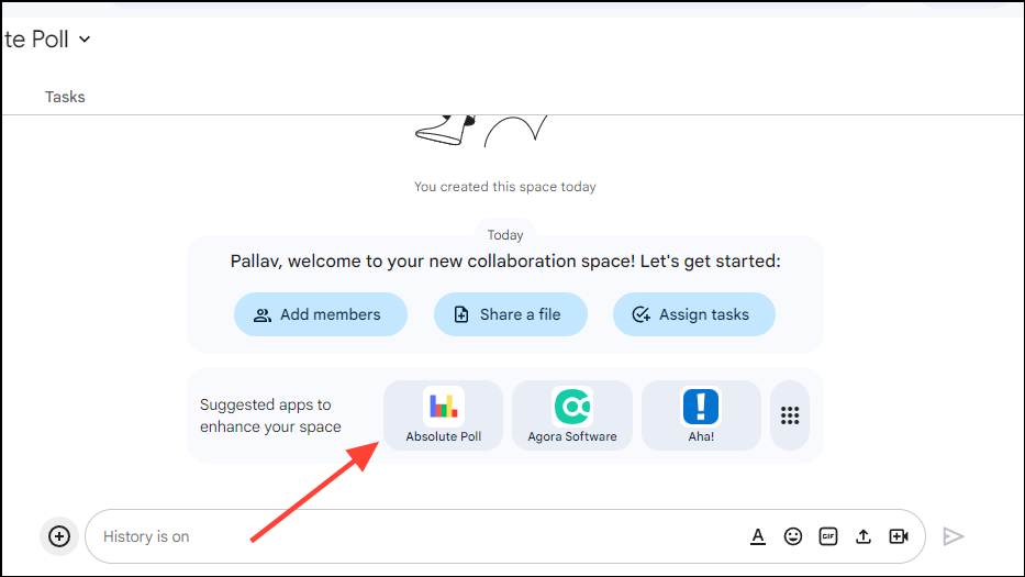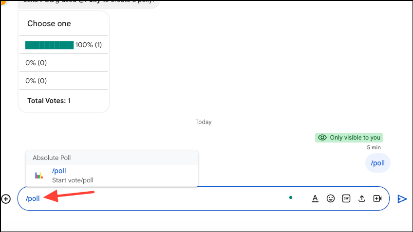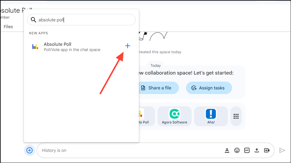 Fortunately, there is a solution to the problem. You can add apps and integrations to the platform to enhance its functionality, and one such app is the Absolute Poll app. It allows you to create polls easily, and even offers additional options for customizing them. Here is how you can create polls in Google Chat using it.
