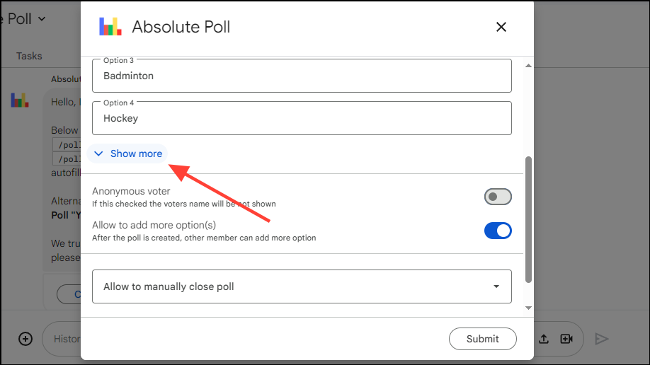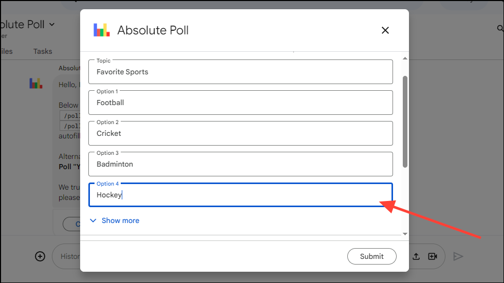 - By default, polls created using the Absolute Poll app have four options. However, you can add more, up to a maximum of ten options by clicking on the 'Show More' option.
