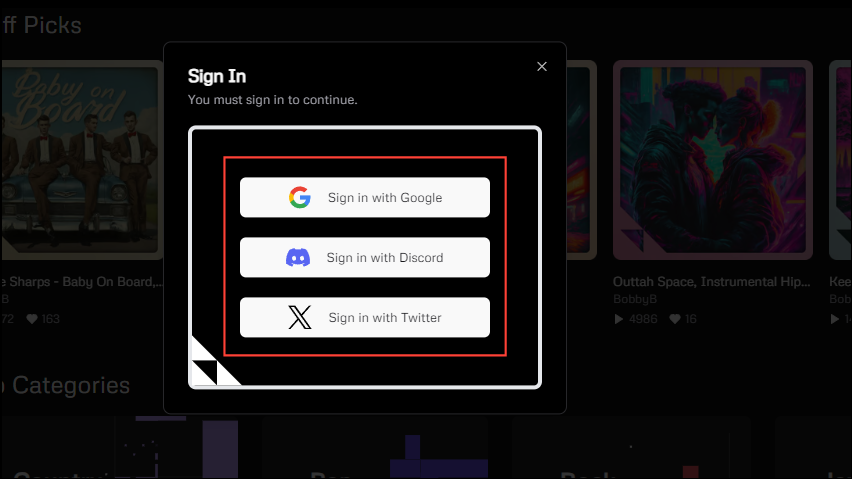 - Clicking on the button will give you a few sign-in options. You can choose to sign in using your Google, Discord, or X (formerly Twitter) account. Click on your preferred option to select it.