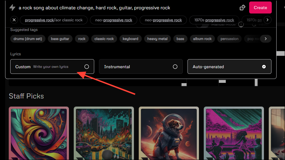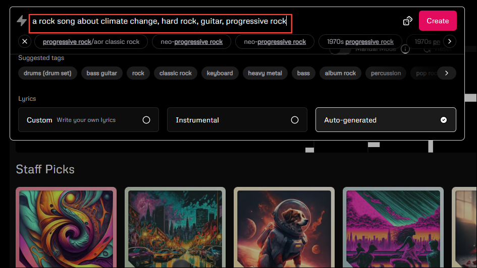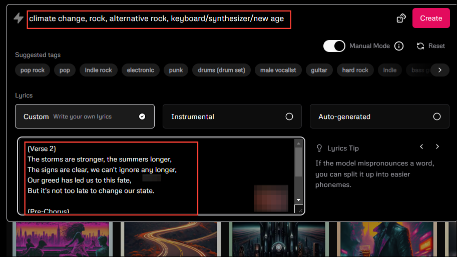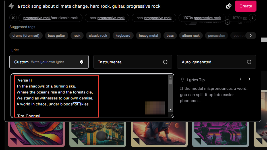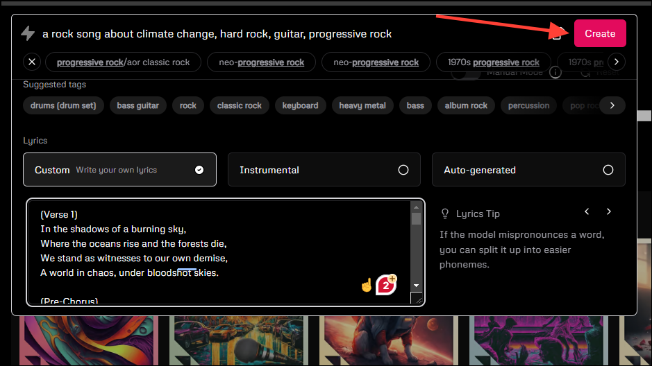 It will try to determine that from the lyrics, so it is a good idea to use custom lyrics. Enter your tags in the prompt box and paste your lyrics in the provided box before clicking on the 'Create' button.