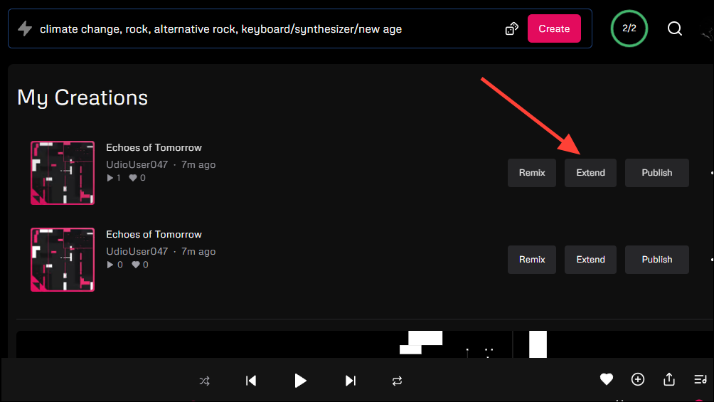 Apart from letting you create original music, Udio lets you extend the tracks you create using the tool. Since it generates music in 32-second sections, it is quite easy to select the one you want to extend.