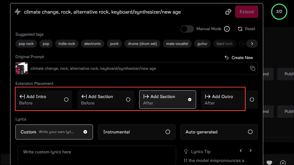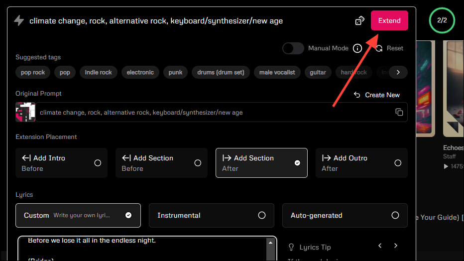 - Just click on your preferred option to extend the song and add some more lyrics in the lyrics box. When you're done, click on the 'Extend' button at the top. You will also be able to see your original prompt here.