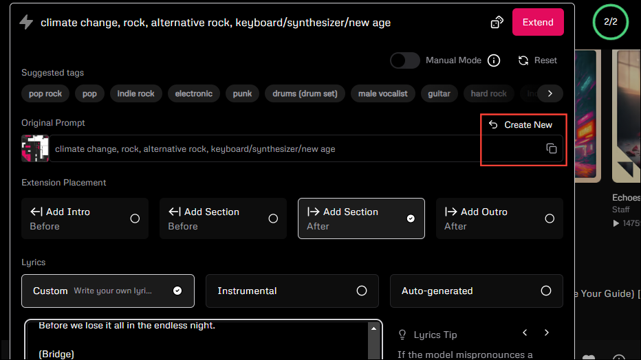- When extending a song, you can go back to the original prompt by clicking on the copy icon on the original prompt. Similarly, you can start a new creation using the 'Create New' button.