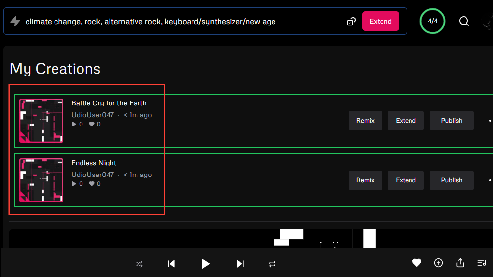 - Udio will take a few minutes to extend your song and add the new lyrics to it. It will then show you the extended tracks. While it uses the original prompt to ensure the section added is consistent with the style of the track, you can always change it by providing a new prompt.