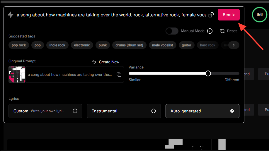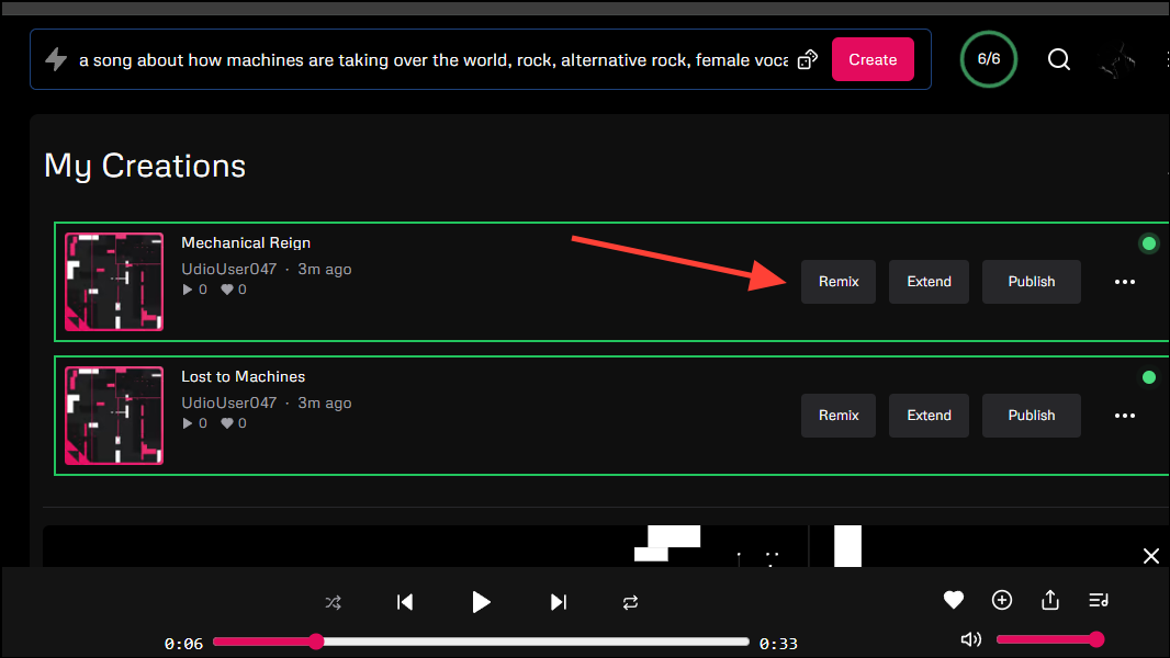 If you want to try out a different variation of the song you created, Udio's 'Remix' feature can help you out. Currently, you can only remix 30-second tracks.