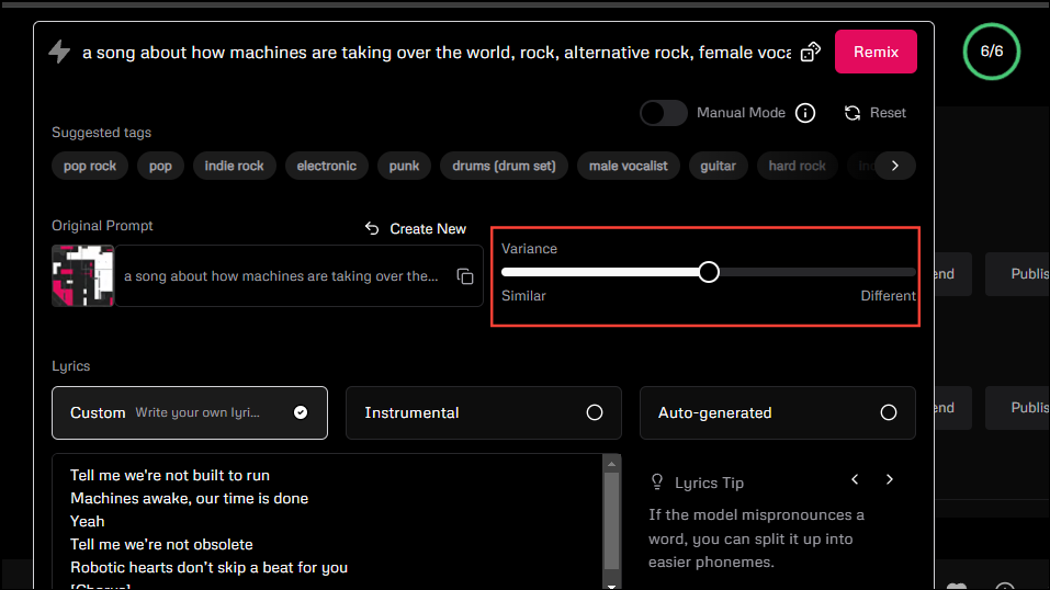 - When you click on it, you can control the amount of variance you want in the remix. Move the slider to the right to increase the variance and to the left to reduce it.