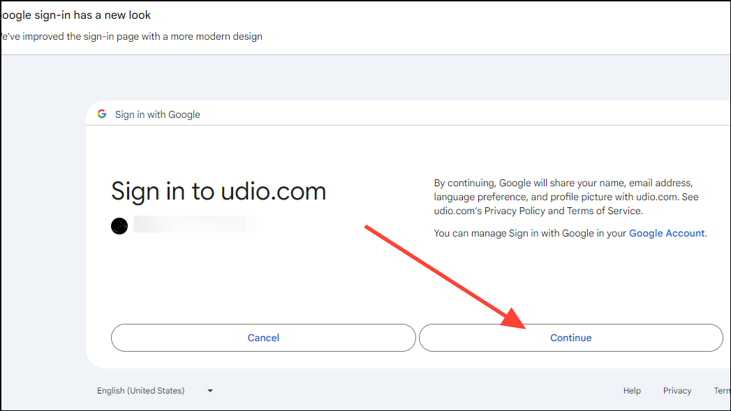 - You will need to provide permission to Udio to access your account for whichever option you choose. Click on the 'Continue' button to do so.