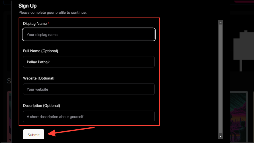 - This will take you to the Udio sign-up page. Here, you need to enter details like name and description before clicking on the 'Submit' button.