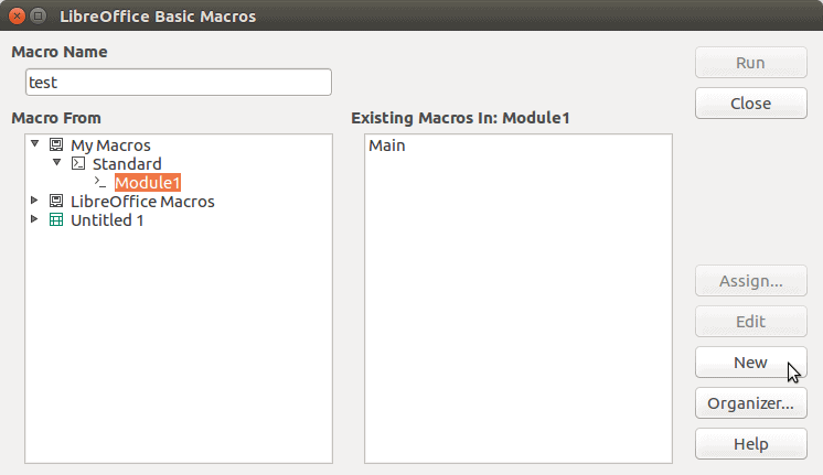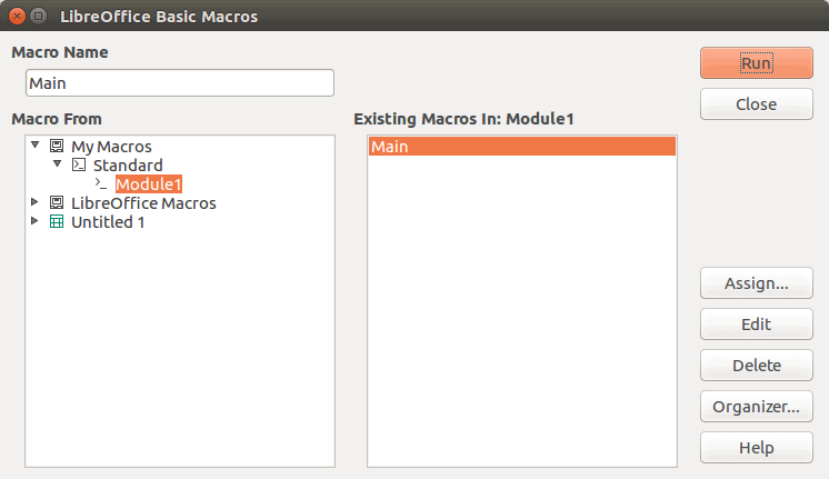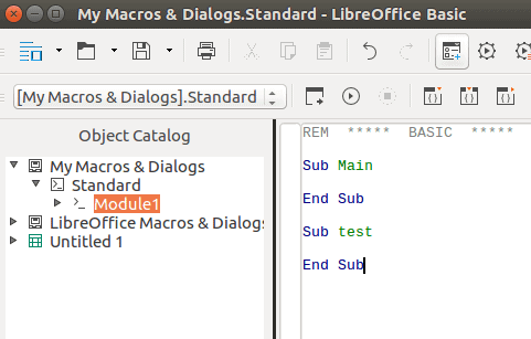 As we can see, manually created Macros are by default created under “My Macros & Dialogs -> Standard -> Module1”.