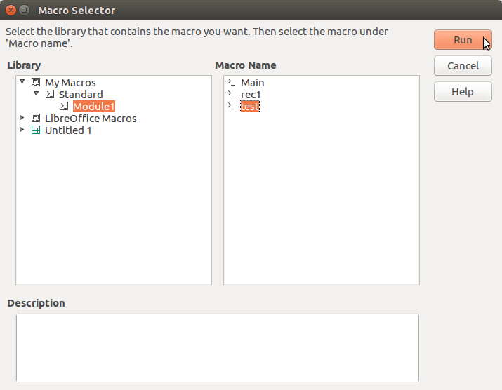 To run the macro, go to Tools » Macros » Run Macro and select your Macro from the “My Macros” directory in Macro Selector Library. Click the Run button after selecting a Macro Name.