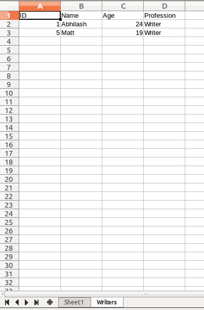 First we create a new sheet with name Writers, at position 1, which is the 2nd position, as index starts at 0. Then we get an object of this newly created sheet, so that we can enter the data of writers in this sheet.