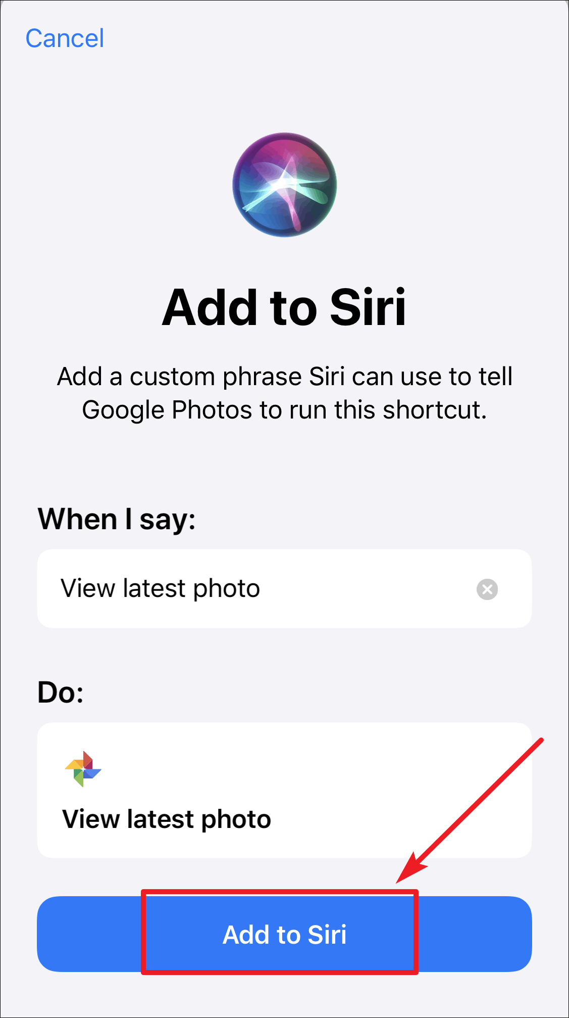 After configuring the Siri shortcut for Google Photos, tap the ‘Add to Siri’ button at the bottom to save/activate the shortcut.