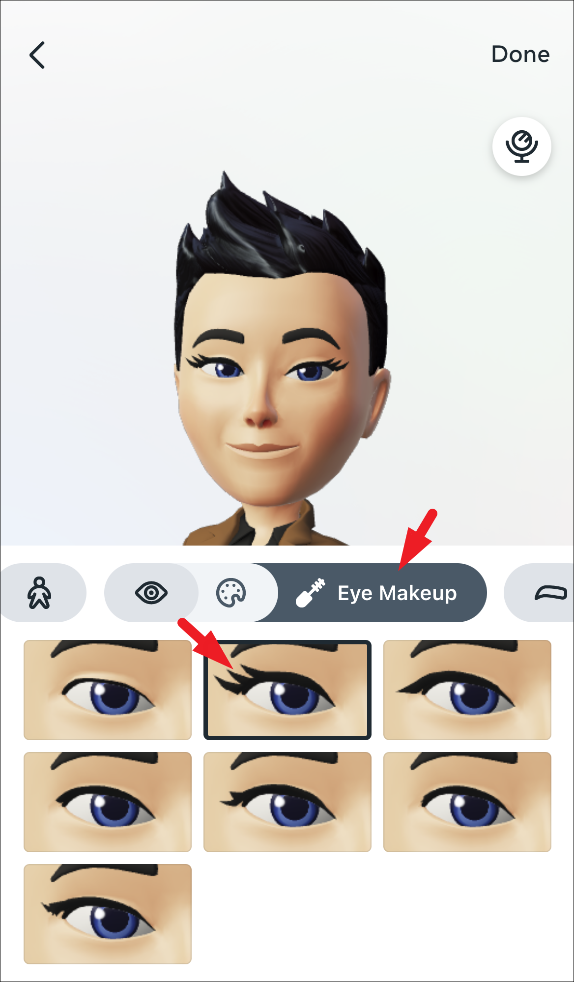 Then, if you wish to add eye makeup, tap on the ‘eye curler’ icon and select an option.
