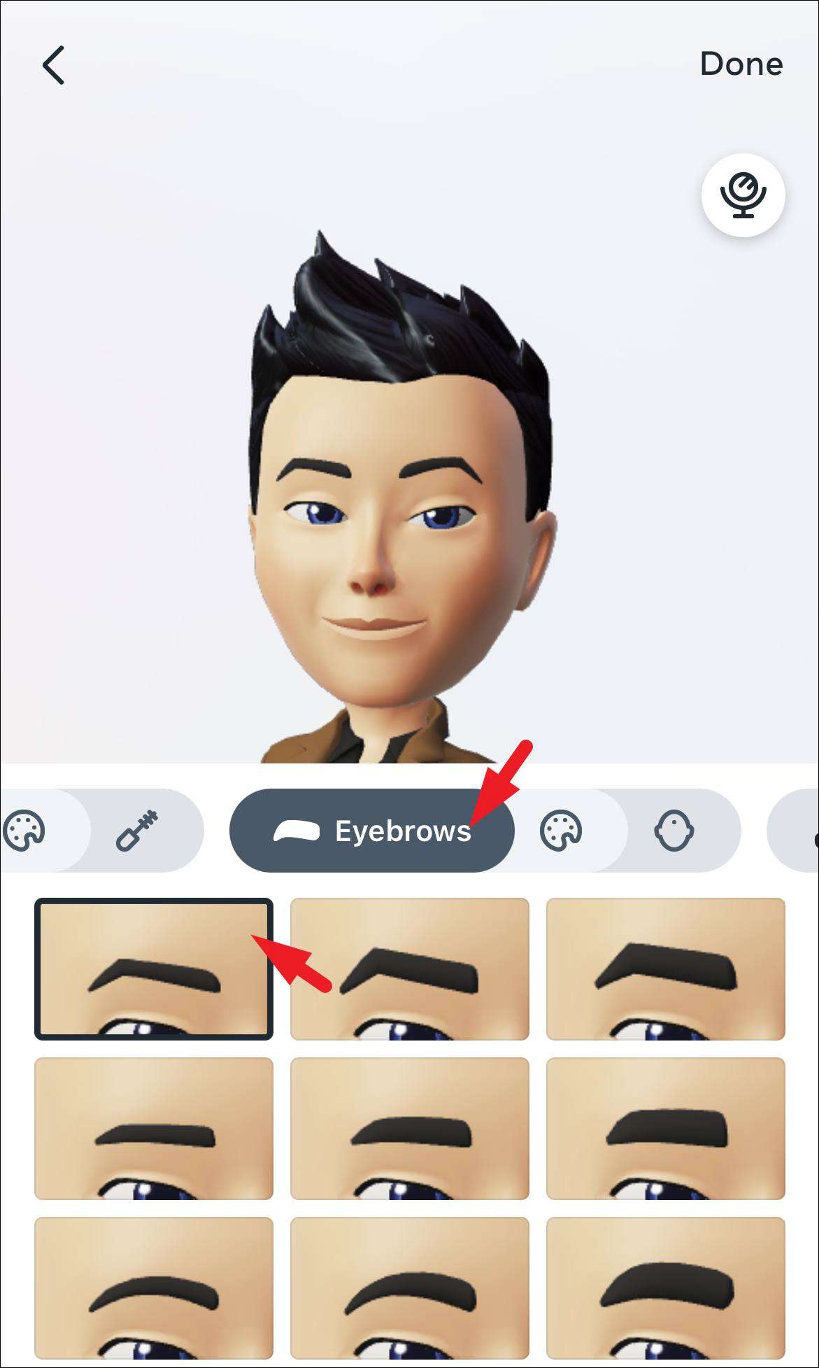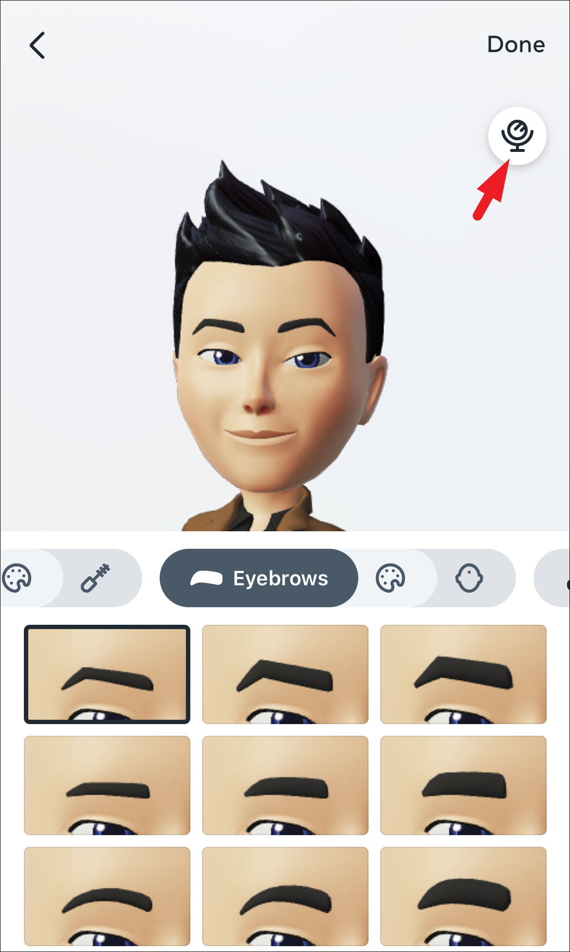 Next, change the shape of the eyebrows by heading to the ‘Eyebrows’ section. You can also change their color by tapping on the ‘color palette’ option.