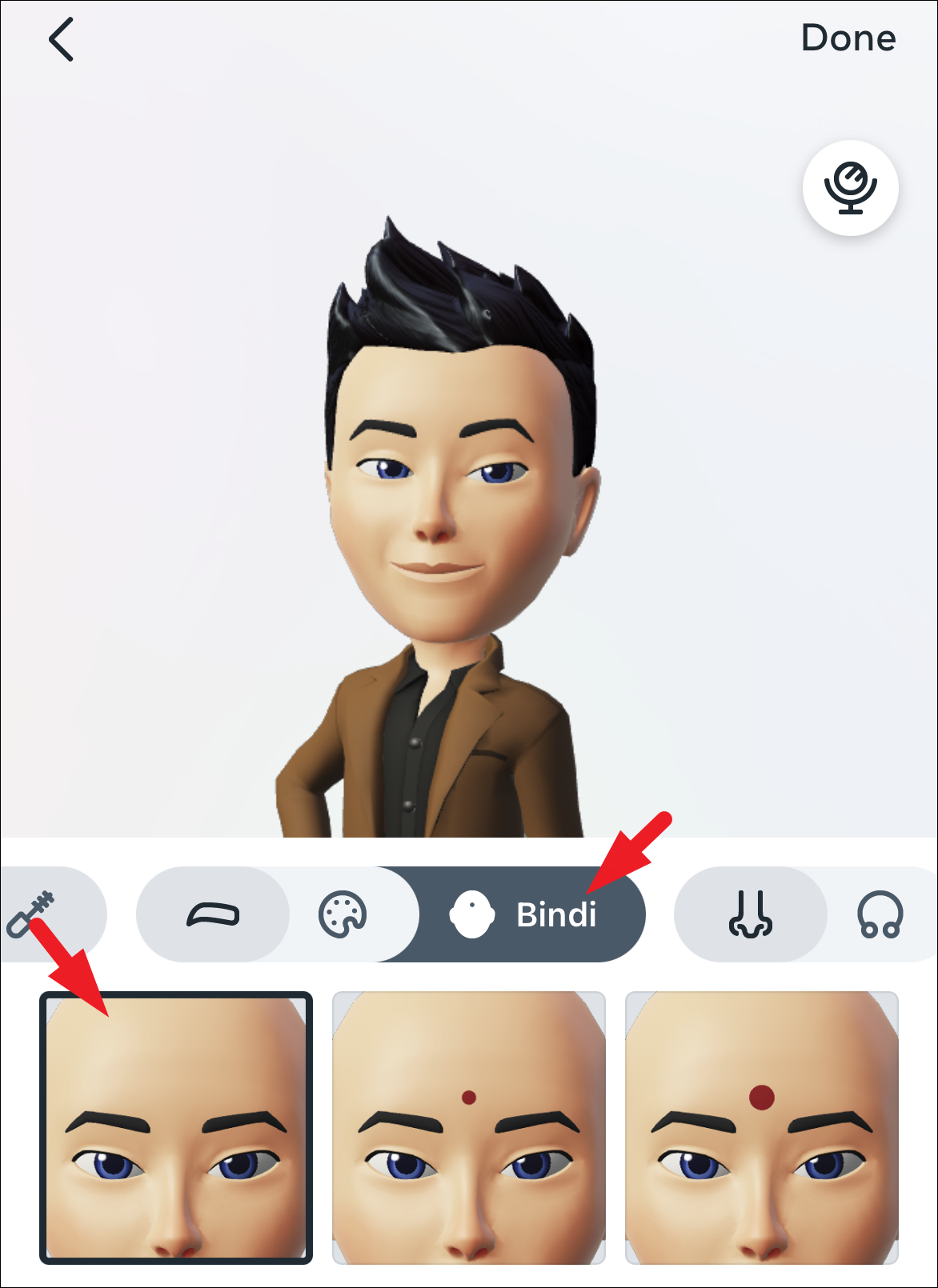 Then, you can also add a ‘bindi’ (a decorative circle-shaped mark applied in the center of the forehead by Indian women) by tapping on the ‘head icon’ tab.