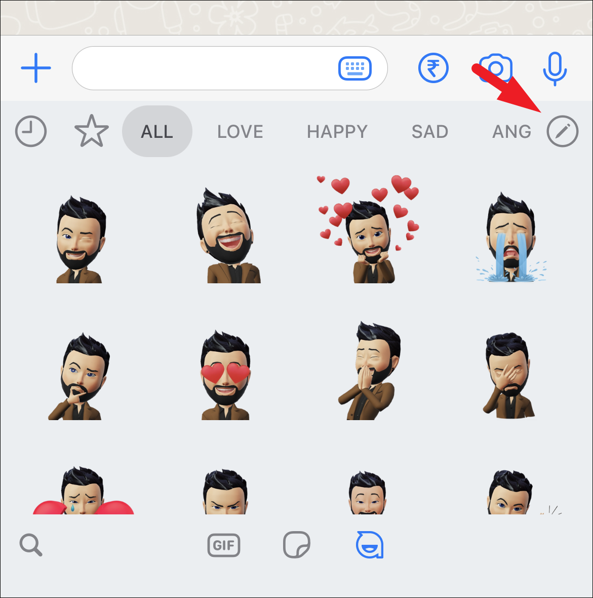 To edit the avatar when already in a chat thread, from the sticker menu, make sure you have selected the ‘avatar’ option from the bottom bar. Then, tap on the ‘Edit’ icon in the top-right corner of the sticker panel.
