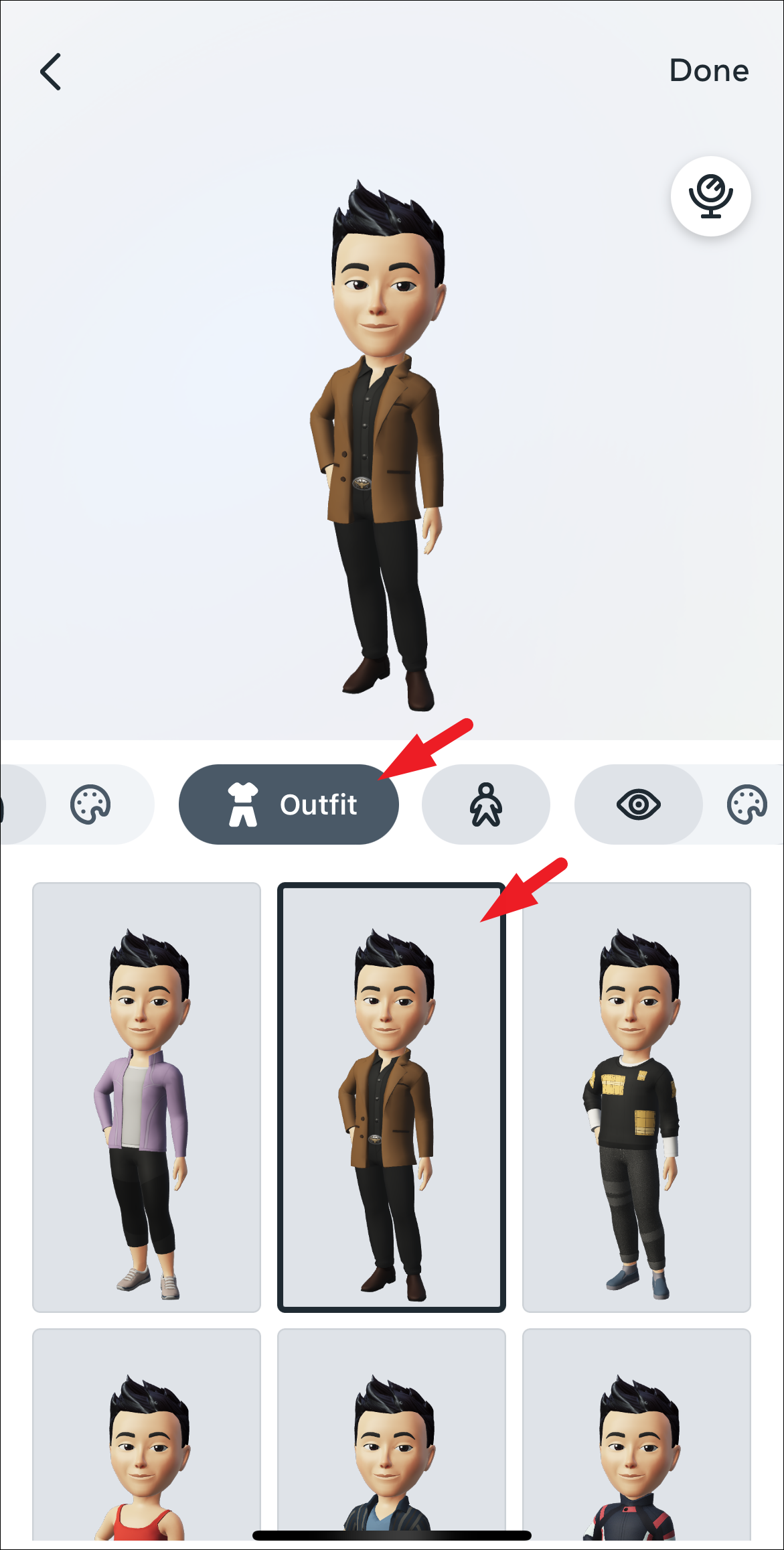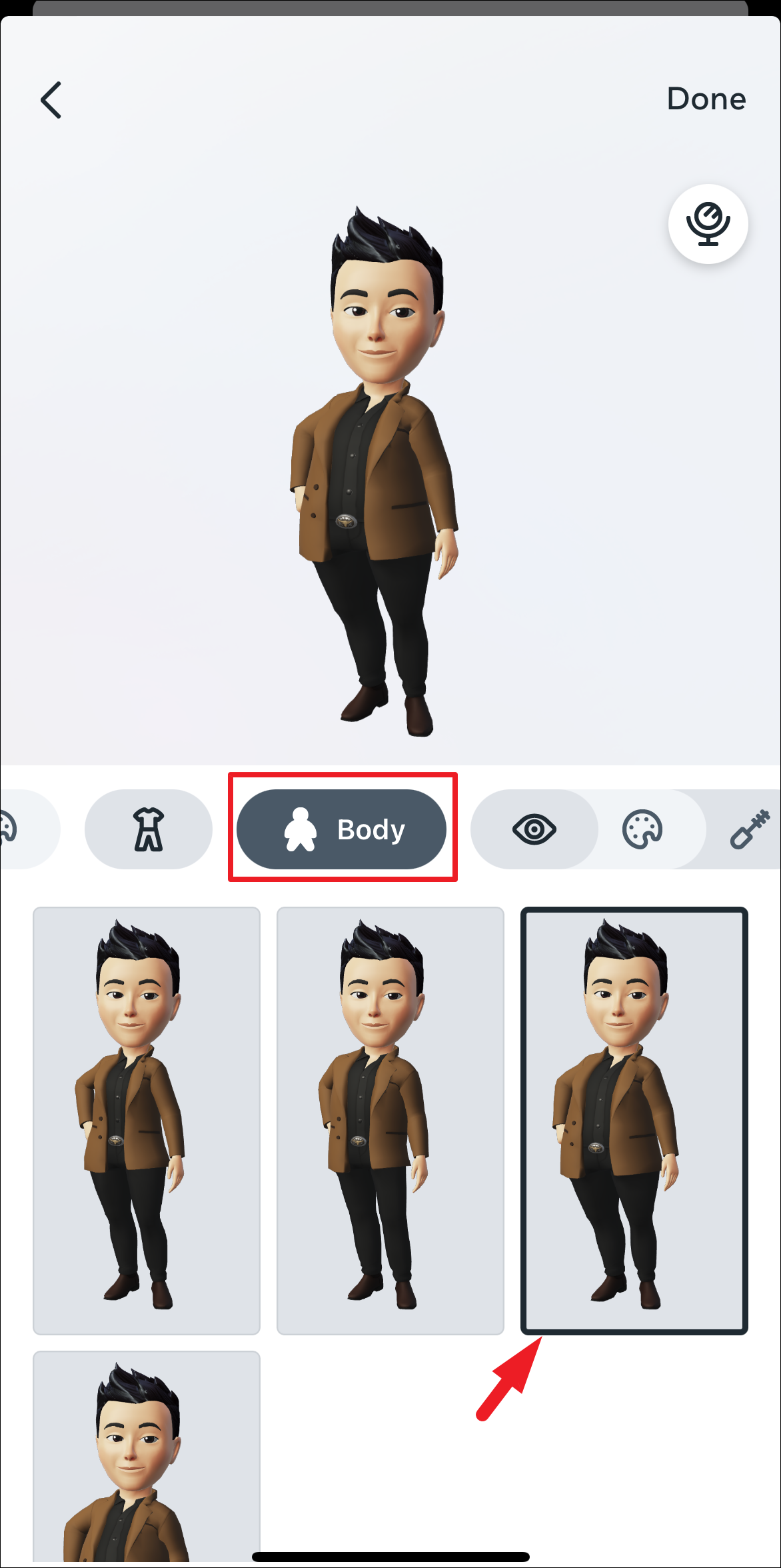 After that, tap on the ‘clothes’ icon to choose an outfit for your avatar. Tap on the one that you wish to set as default. At the time of writing this article, you can only select a complete outfit from a set of pre-defined options instead of being able to choose each clothing item. Once done, tap on the ‘Body’ icon to proceed.