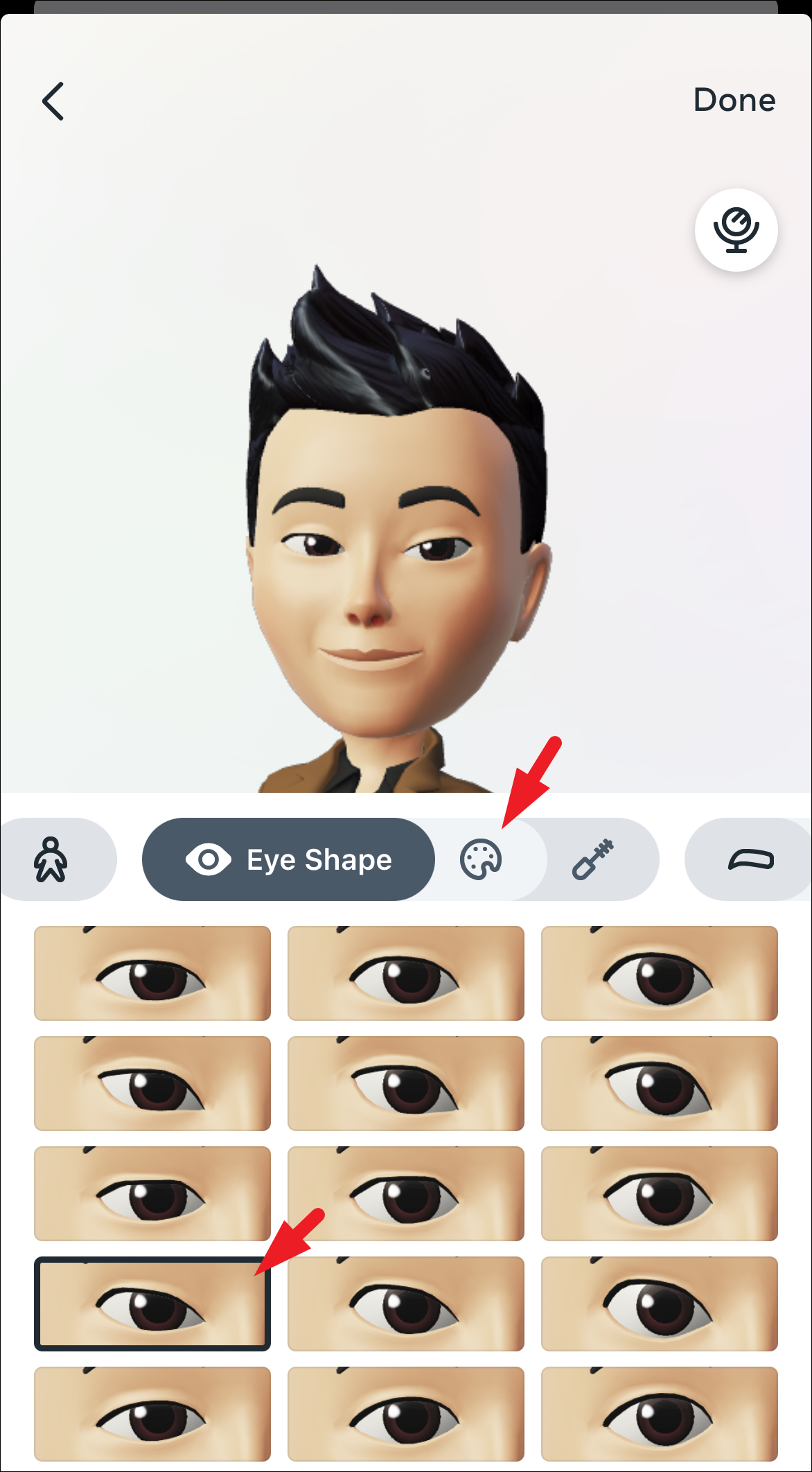 You can now choose an eye shape by tapping on one of the options. If you wish to change the color of the pupil, tap on the ‘color palette’ option and choose a color of your choice.