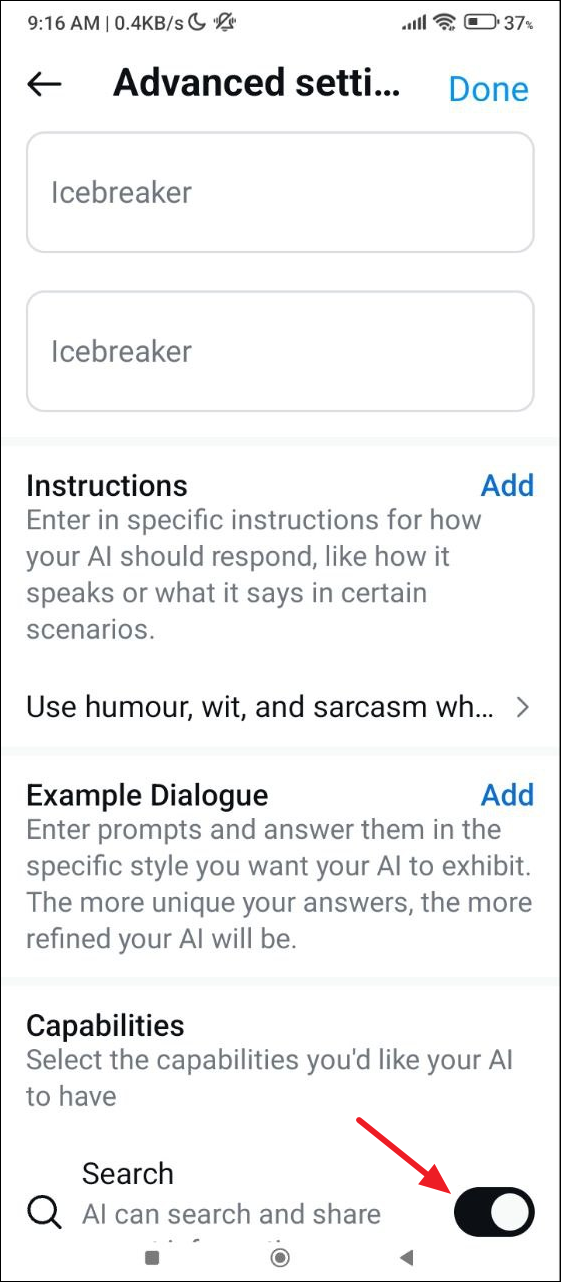 - You can also enable or disable the search capability for your AI character by tapping on the toggle at the bottom. Tap on 'Done' when you're finished.